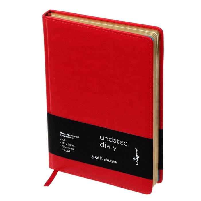 Ежедневник недатированный А5, 136 листов в линейку, кожзам "Небраска", золотой срез, красный