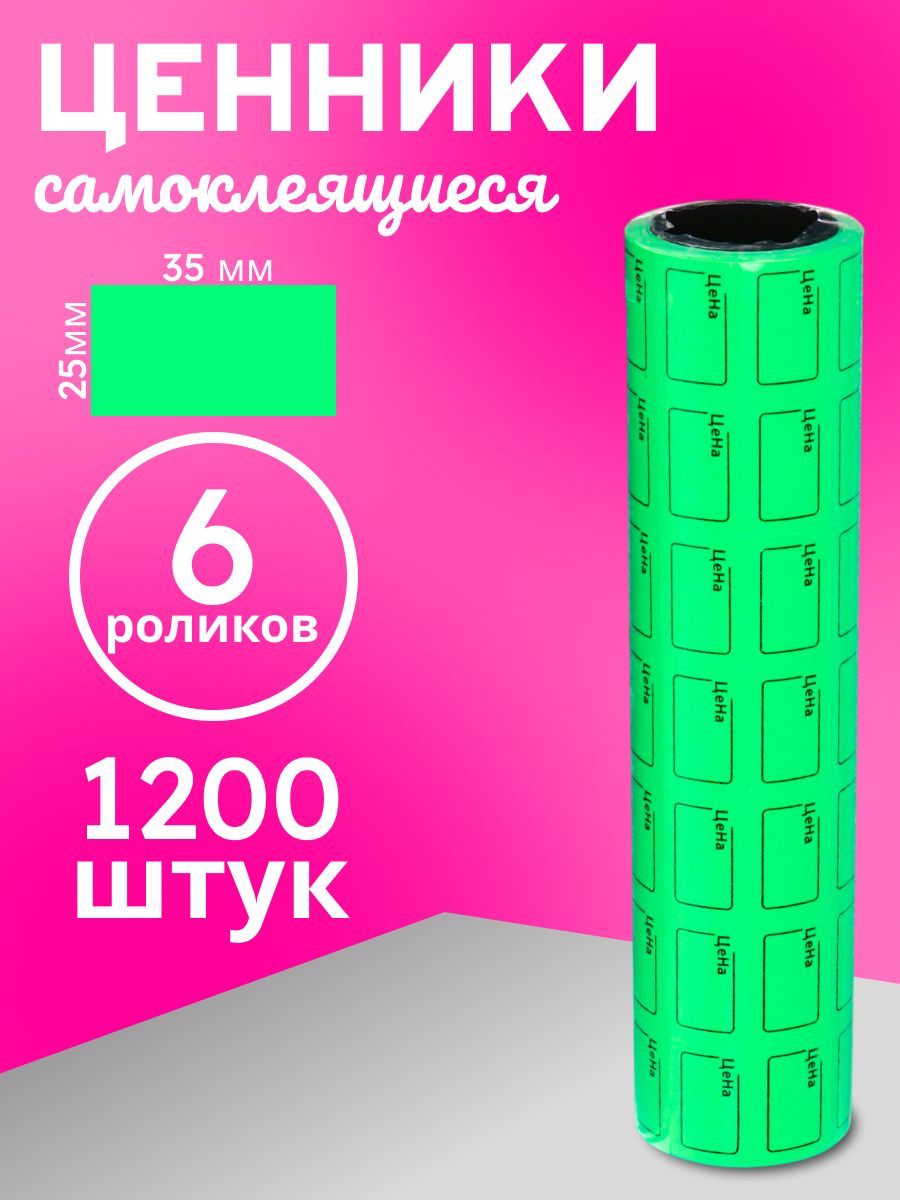 Набор из 6 роликов, в 1 ролике 200 штук, ценники самоклеящиеся, 25 х 35 мм, зелёные