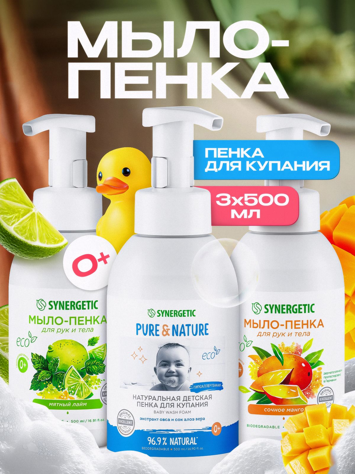 Детская пенка для купания и жидкое мыло пенка для рук и тела SYNERGETIC, гипоаллергенное, 500 мл, 3шт