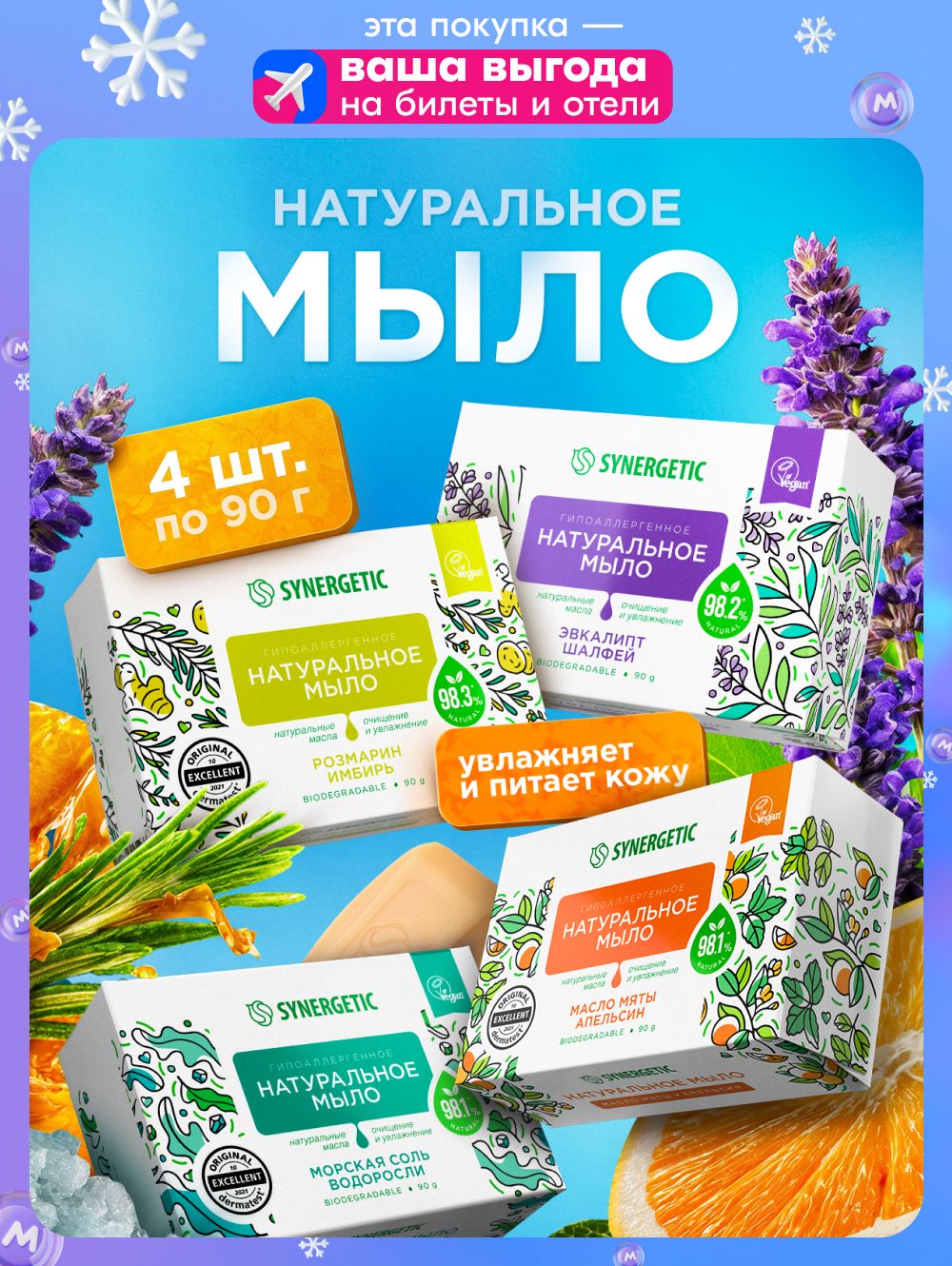 Мыло твердое для рук и тела SYNERGETIC, набор из 4 шт по 90 гр.