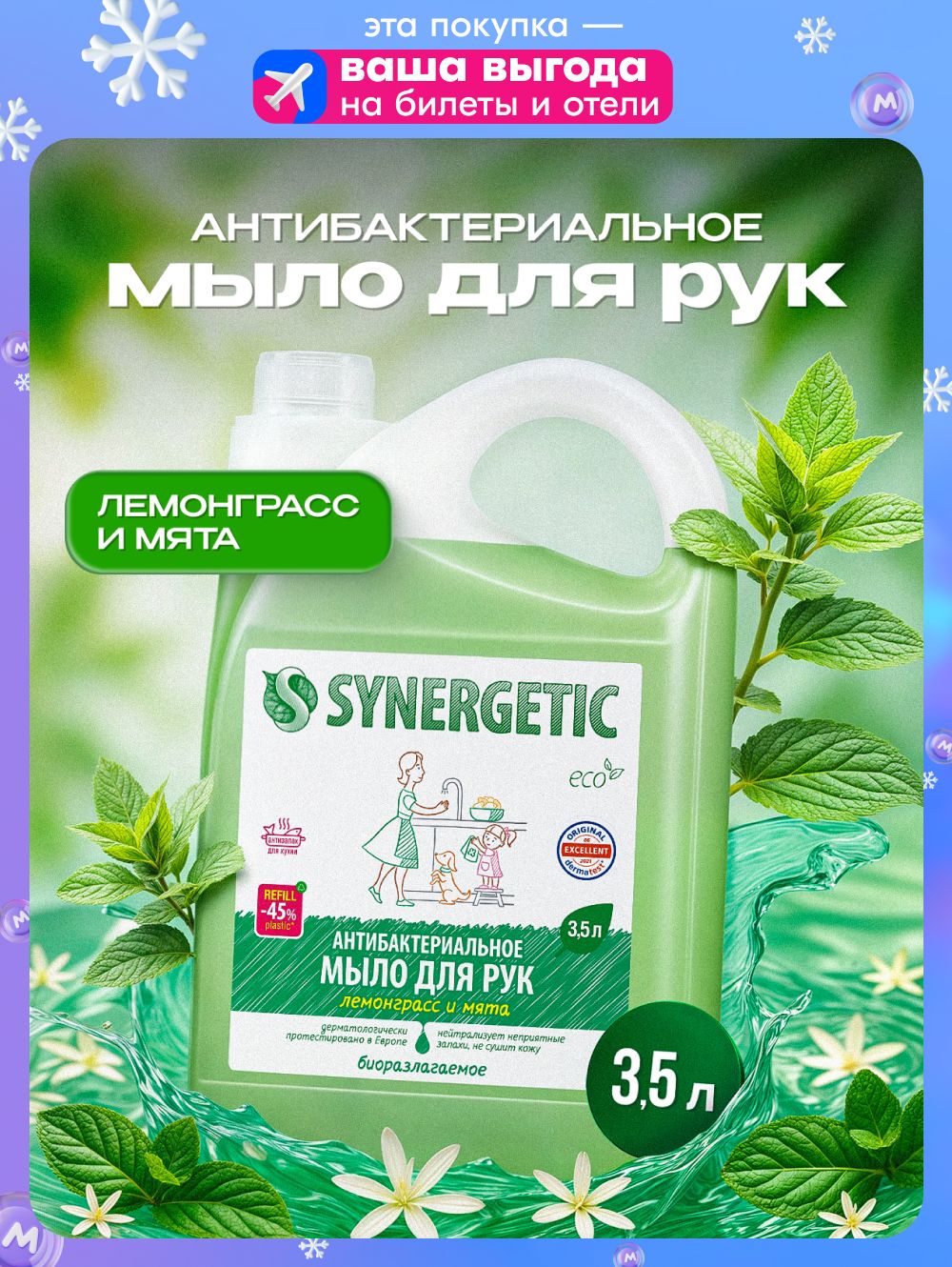 Жидкое мыло для рук SYNERGETIC "Лемонграсс и мята" антибактериальное, 3,5л, гипоаллергенное, антибактериальное