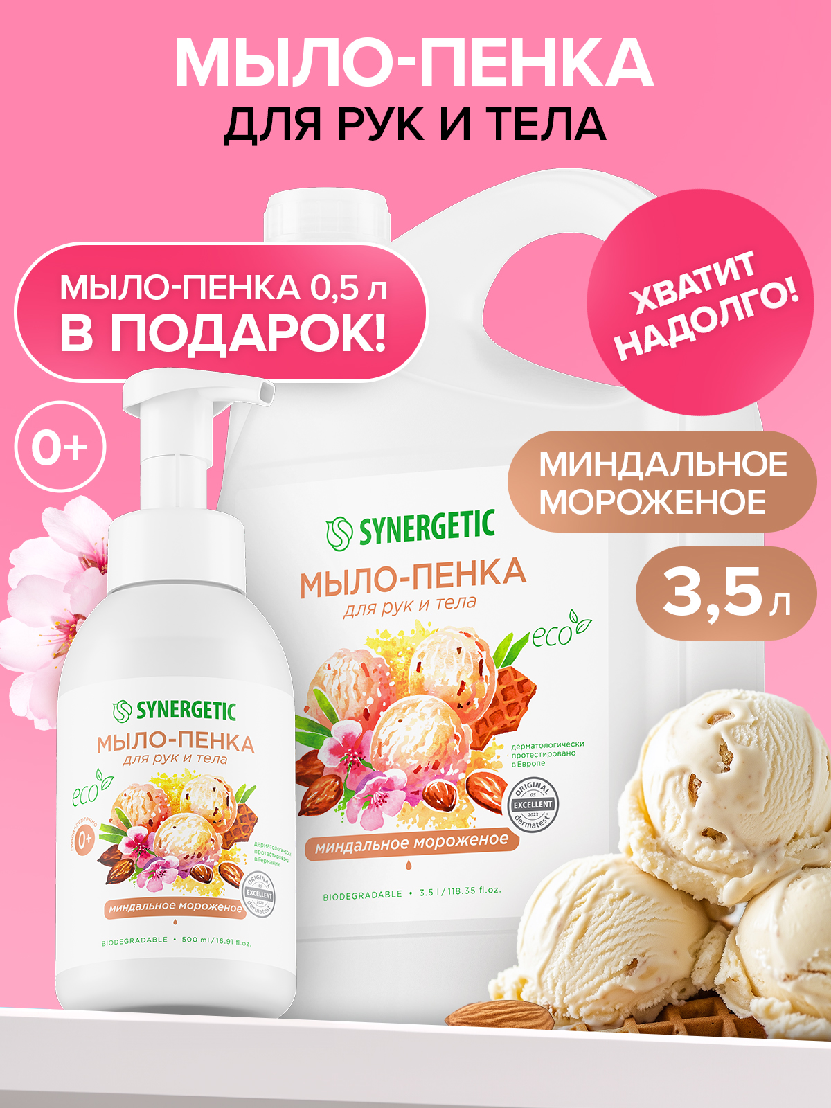 Жидкое мыло/пенка для рук и тела SYNERGETIC Миндальное мороженое 3,5 л + ФЛАКОН-ПОДАРОК 0,5 л с пенообразующей насадкой (Набор), гипоаллергенное, антибактериальное