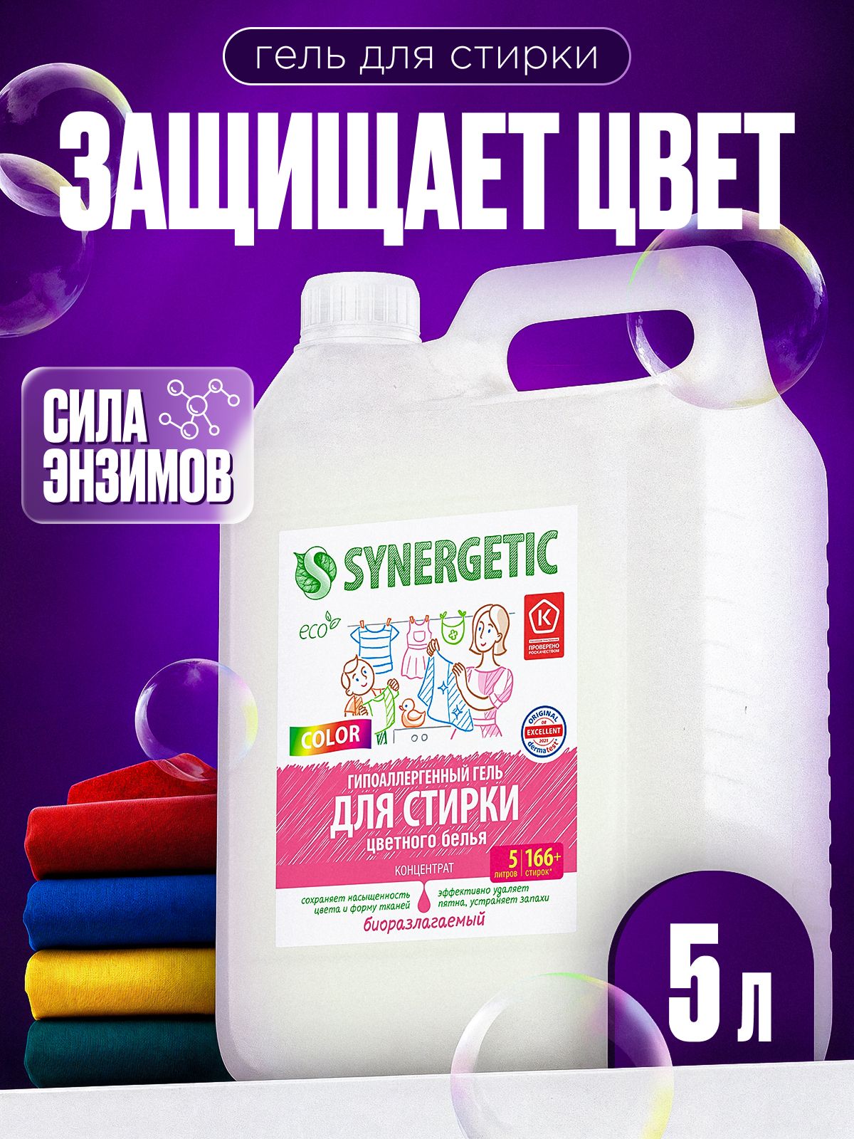 Гель для стирки цветного белья SYNERGETIC COLOR, 5 л (166+ стирок)