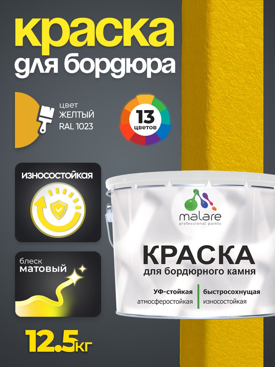 Краска Malare для бордюрного камня, тротуарных камней и плит, износостойкая, быстросохнущая, матовая RAL 1023, желтый, 12,5 кг