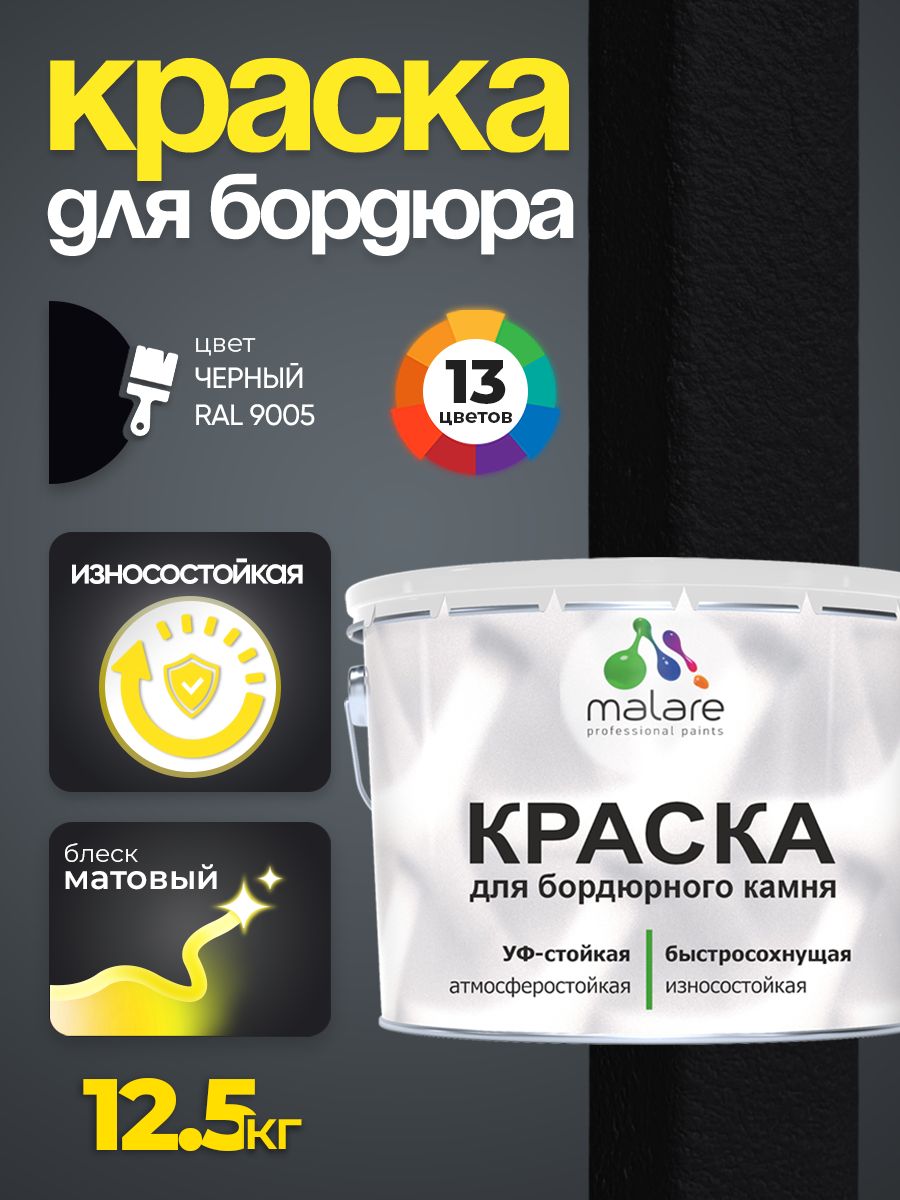 Краска Malare для бордюрного камня, тротуарных камней и плит, износостойкая, быстросохнущая, матовая RAL 9005, черный, 12,5 кг