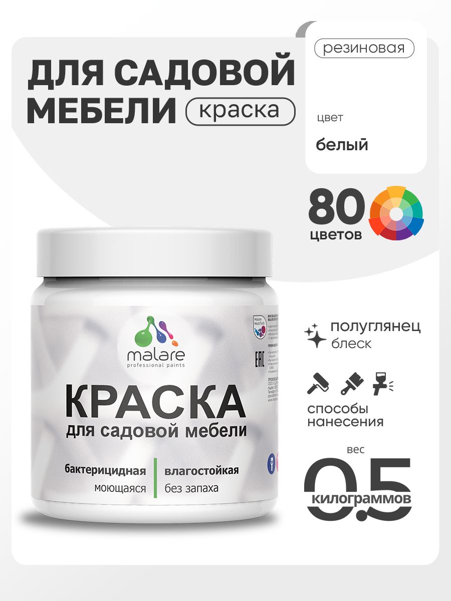 Резиновая краска Malare для садовой мебели/ по дереву, для наружных и внутренних работ/ быстросохнущая моющаяся без запаха полуглянцевая, белая, 0.5 кг