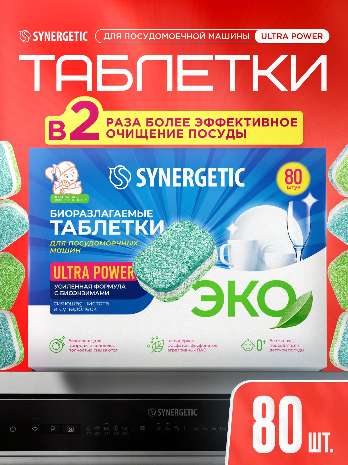 Таблетки для посудомоечных машин SYNERGETIC ULTRA POWER 80 шт, усиленная формула, в водорастворимой пленке, эко